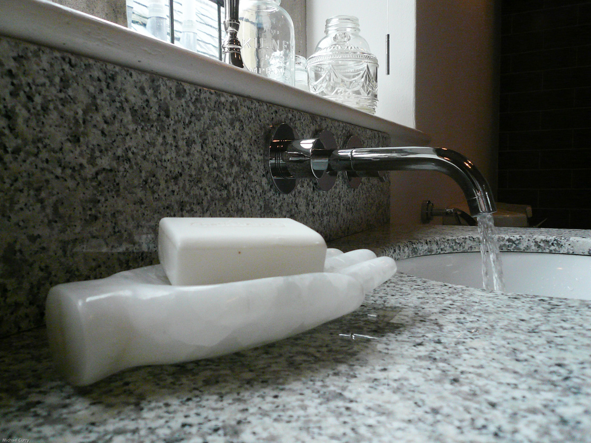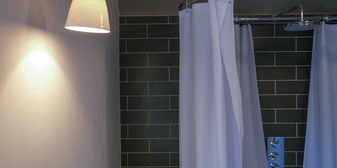 Warm taupes and chocolate colours combine with travertine floor tiles to create a warm scheme, illuminated by some very stylish lighting by Jim Lawrence and Original BTC, and recessed uplighters in the floor behind the bath. Large format, matt brick pattern tiles in dark brown “ground” the scheme behind the halo-like form of the oval shower curtain ring, with it’s heavy duty white cotton curtains like wings.