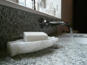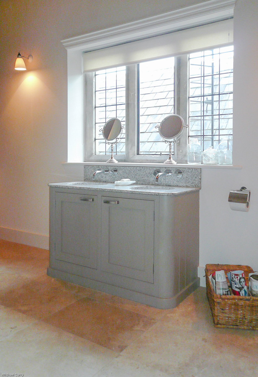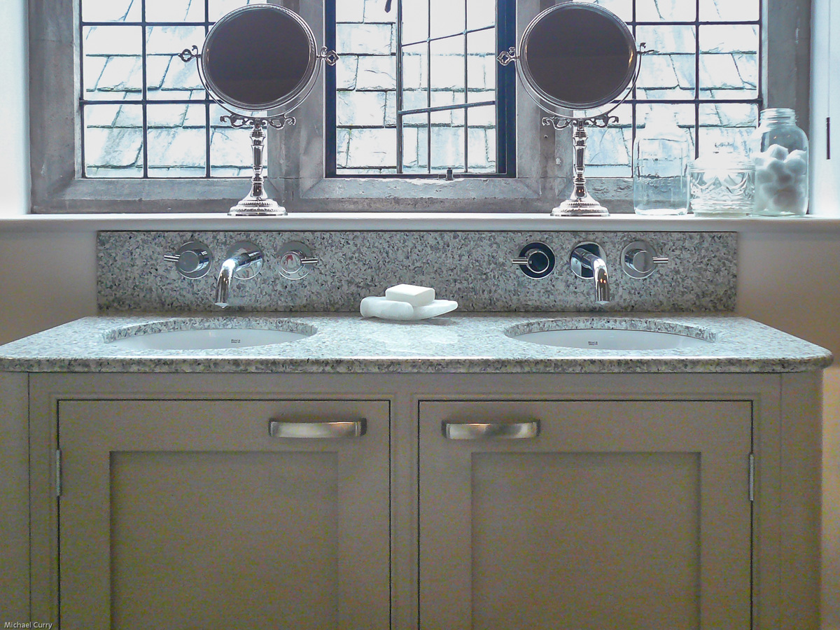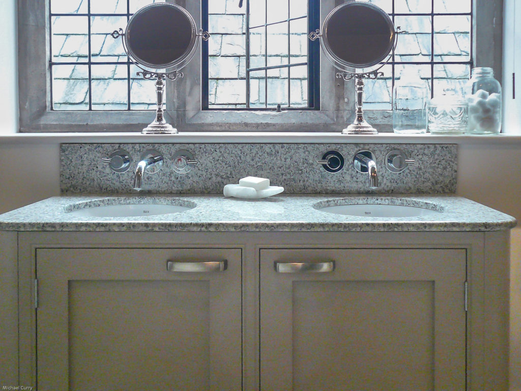 This bathroom was designed to match the style of the Waterfall Design-ed kitchen, which in turn was conceived and designed to fit in the converted Edwardian fire station under the Clock Tower on Shockerwick estate on the outskirts of Bath. Traditional inframe cabinetry, tongue & groove panelling and round edged granite countertops compliment a traditional cast iron roll-top bath – the sole item on the customer’s original wishlist.