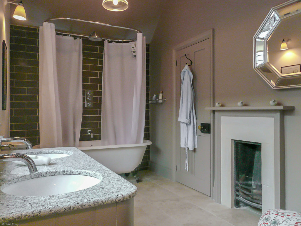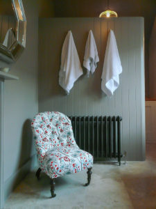 As the unusual, high vaulted ceilinged room had to contain the oil fired boiler as well as laundry facilities we designed a demi-wall, clad in tongue & groove panelling to conceal these features while helping create a more intimate bathing area, complete with antique mirror and reupholstered nursing chair by the new bronze coloured cast iron radiator.
