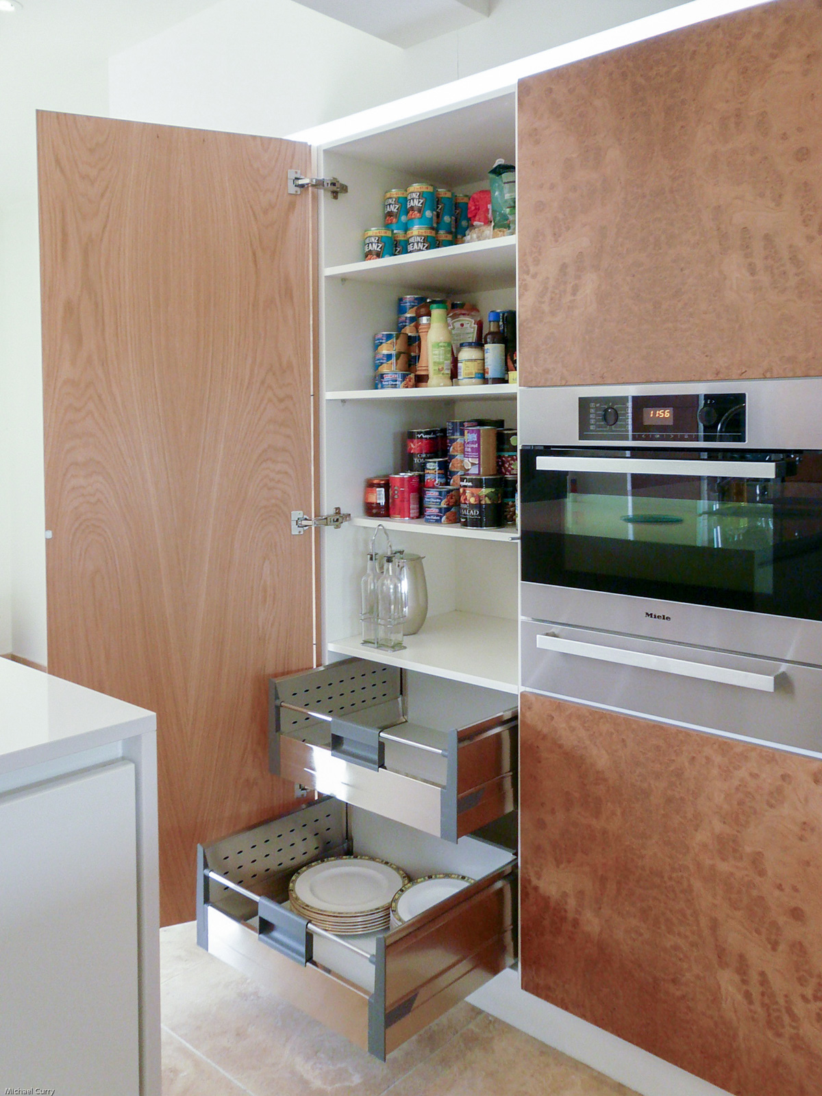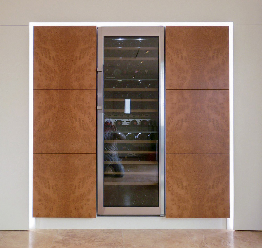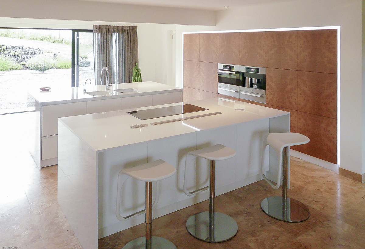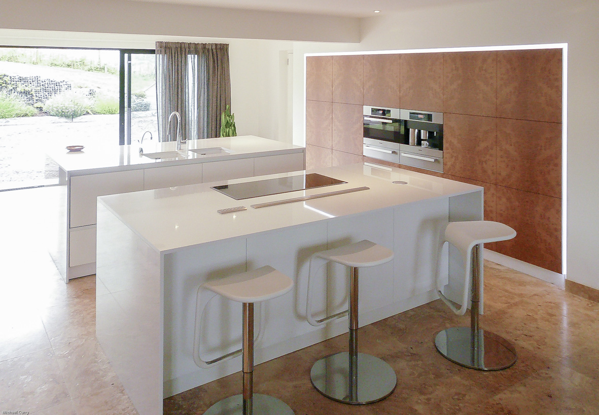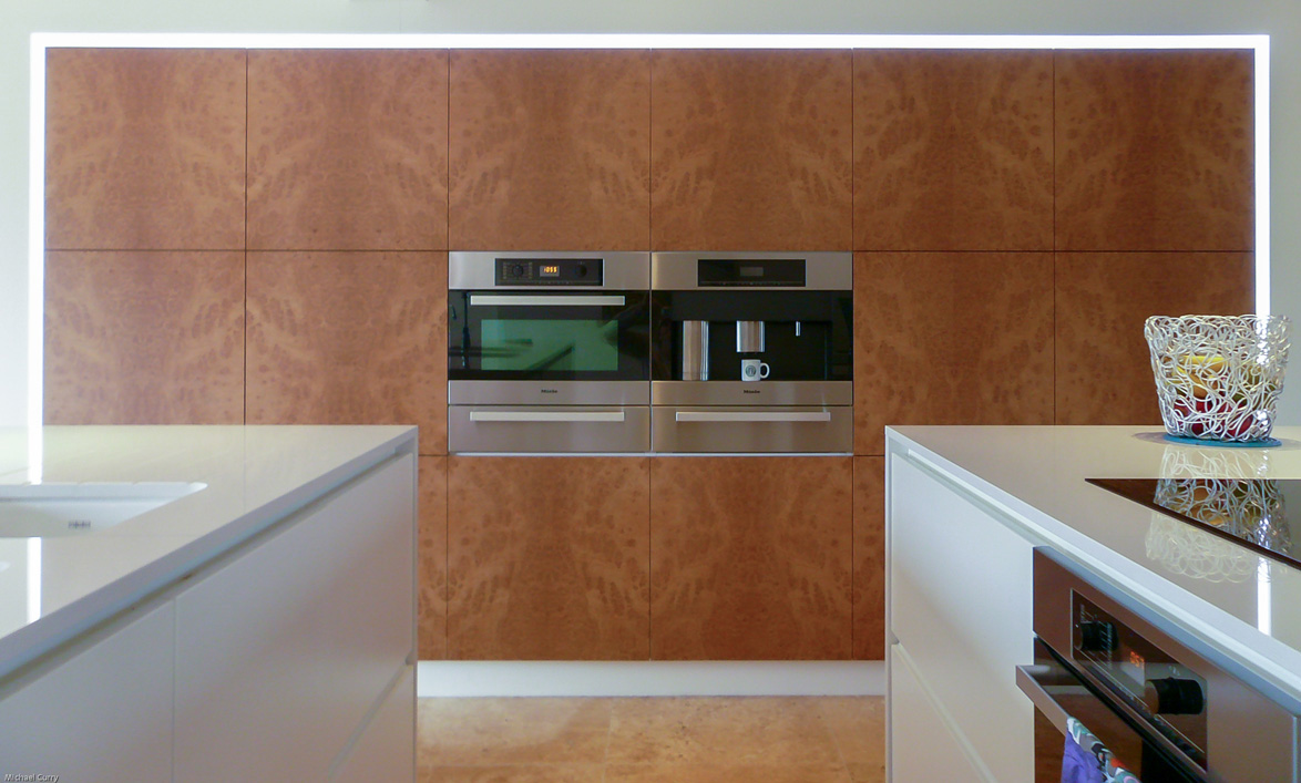 Complimenting and grounding the sleek white islands is a row of tall cabinets, handleless, and conceived to look like plush panelling in book-matched Burr Oak veneer. Boxing around the cabinets creates the impression that the panels are decorative, when in fact they conceal a multitude of storage options including internal drawers and additional refrigeration. The oak panels are surrounded by a recess for opening the end doors and containing LED strip lighting to highlight this beautiful