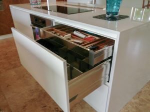 With the new kitchen dining room unified with warm travertine stone floor tiling we designed two pure white minimalist islands with true handleless hi-gloss doors and Silestone quartz worktops to create large sculptural but light pieces of furniture. “Under the bonnet” the islands have Fischer and Paykel dishwashing drawers and Hotpoint fridge drawers as well as pull-out waste sorters, deep and internal drawers, a boiling water tap and a Miele oven. The “wet” island has an LED lit Franke tap and Insikerator hot water tap, while the “cooking” island has a panorama Miele induction hob and Wolf downdraft extractor – the air ducted under the floor to the exterior rather than breaking up the space with a conventional hood.