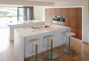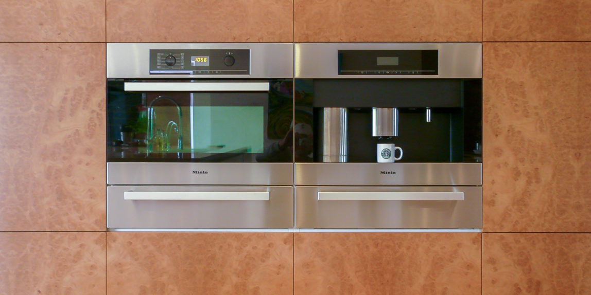 feature, which serves to unify the existing with the new space we created. Symmetry is enhanced by the Miele coffee maker, additional oven and warming drawers in the centre.